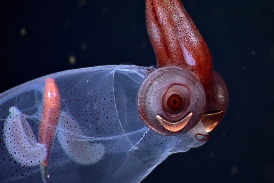 Перед вами кальмар-какаду (Taonius borealis) из семейства кранхиидов, которых ещё называют стеклянными кальмарами, из-за их особенности иметь почти полностью прозрачное тело.