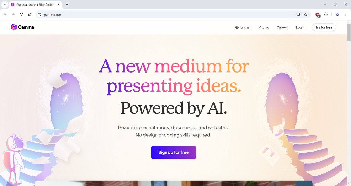 Gamma App – это альтернатива -онлайн и -оффлайн редакторам презентаций. Данный ресурс позволяет создавать увлекательные презентации, используя текст, изображения, анимацию и видео, а также заметки, краткие описания и документы, которые затем можно легко обсуждать в режиме реального времени или делиться ими в асинхронном формате. Все инструменты находятся в браузере, т.е. ничего не нужно скачивать и устанавливать на ваш компьютер.