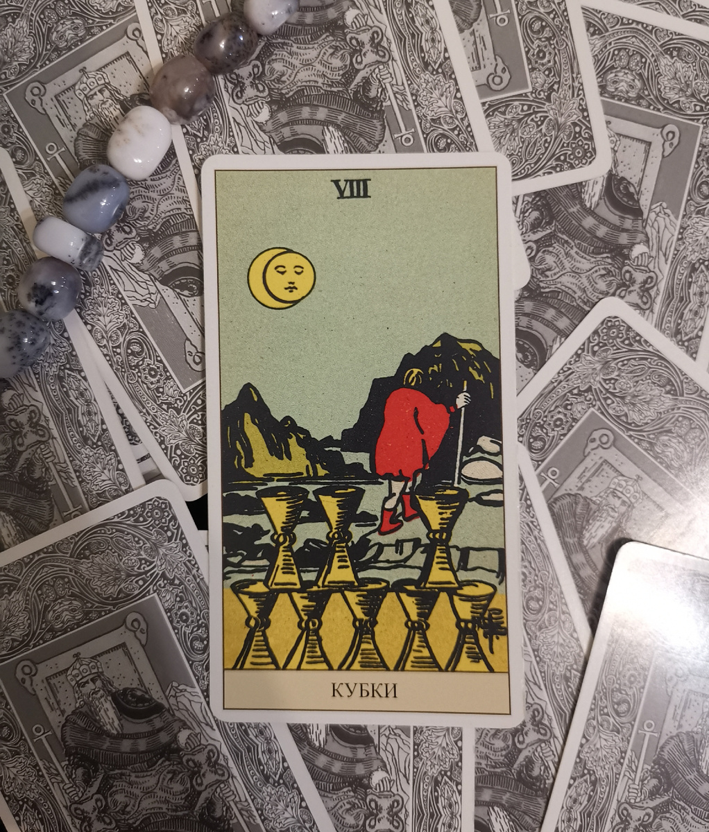 Здесь мы видим один из самых неотразимых образов в колоды Уэйта: тему движения через призму эмоциональной масти: кто-то уходит, и оставляет что-то позади. Можно представить себе, что персонаж Семёрки потерпел разочарование в любви (или фантазиях) и теперь, должен двигаться дальше. Обратите внимание что кубки не валяются на земле, как в Пятёрке. Человек понимает, что настало время уходить. Самые свежие интерпретации подчёркивают, что в верхнем ряду кубков есть промежуток, поэтому персонаж, возможно, отправляется на поиски того, что в его жизни не хватает (сомневаюсь в этой трактовке). Вверху сияет месяц, но вся Атмосфера картинки намекает, что это, в принципе может быть и затмение солнца - то есть переключение с солярной энергии на лунарную. Всё это, конечно, очень интересно, но никак не сочетается с темами, обычными для числа восемь. Восьмёрка - это тема повторений, цикличности, и исходя из этого следует что Восьмёрка Кубков - это кто-то, снова и снова выбирающий партнёров одного