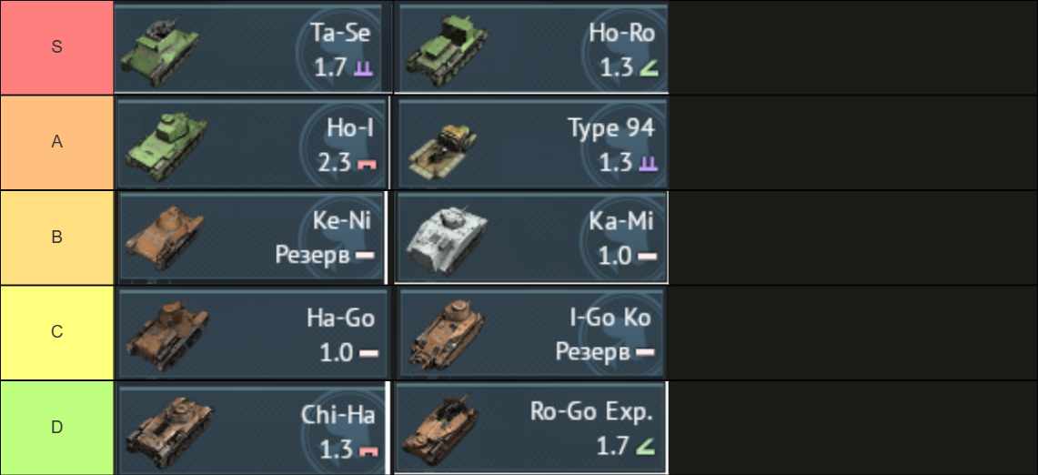 Перед тем, как начнём, хочу сказать, что тир лист является моим субъективным мнением, и каждый сам должен решать, какой танк для него имба, а какой нет! Если в аркаде у него хотя бы есть мобильность, то в реалистике ты будешь не поворотливым, медленным, с средним пробитием и без нормального урона и с редко танкующей бронёй. На выбор два снаряда: Каморный и Кумулятивный. Первый даже рассматривать не надо у него пробой 21 мм, а вот кумулятив с 55 мм ещё что-то может. Буду краток, мобильности нет, брони нет, а если играть ради пушки, то лучше идти играть на Ho-Ro. Это Chi-ha только меньше и с каморниками на 34мм пробоя, так ещё имеет хотя бы какую-то, но мобильность. Неплох для того, чтобы крысить противников. Chi-ha только помедленней. Но в отличие от Chi-ha он имеет бр 1.0, а также высокий, что поможет стрелять за некоторыми укрытиями. По сути говоря Ha-go, только с иногда танкующей бронёй, пробитием 47мм и с лучшей мобильностью. Из прям больших минусов он большой. А так пробитие средн