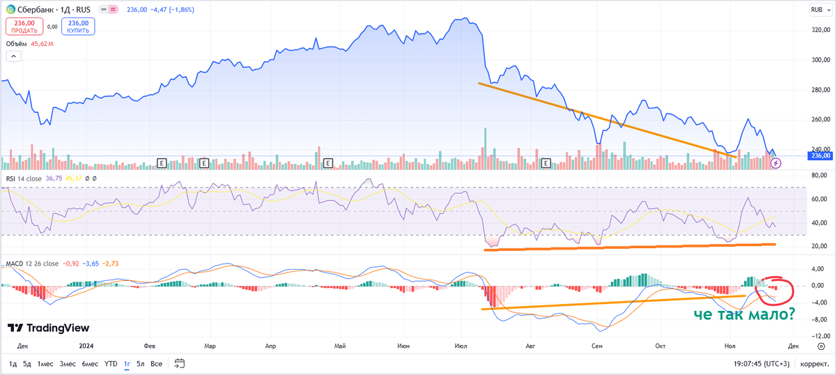К сожалению, пока совершенно непонятно, как будут вести себя акции Сбербанка в дальней перспективе. Однако в ближайшей перспективе прорисовывается четкий, даже сказал бы, очевидный сигнал на смену направления курса. На графике видна дивергенция по RSI и MACD, и, кроме того, видно, что объемов на снижение просто нет. Я ожидаю в ближайшей перспективе рост цены. Однако, по всей видимости это не более, чем коррекция. Желающие могут закупиться на небольшую часть котлеты и ожидать роста до района 280, где и продать закупленное.