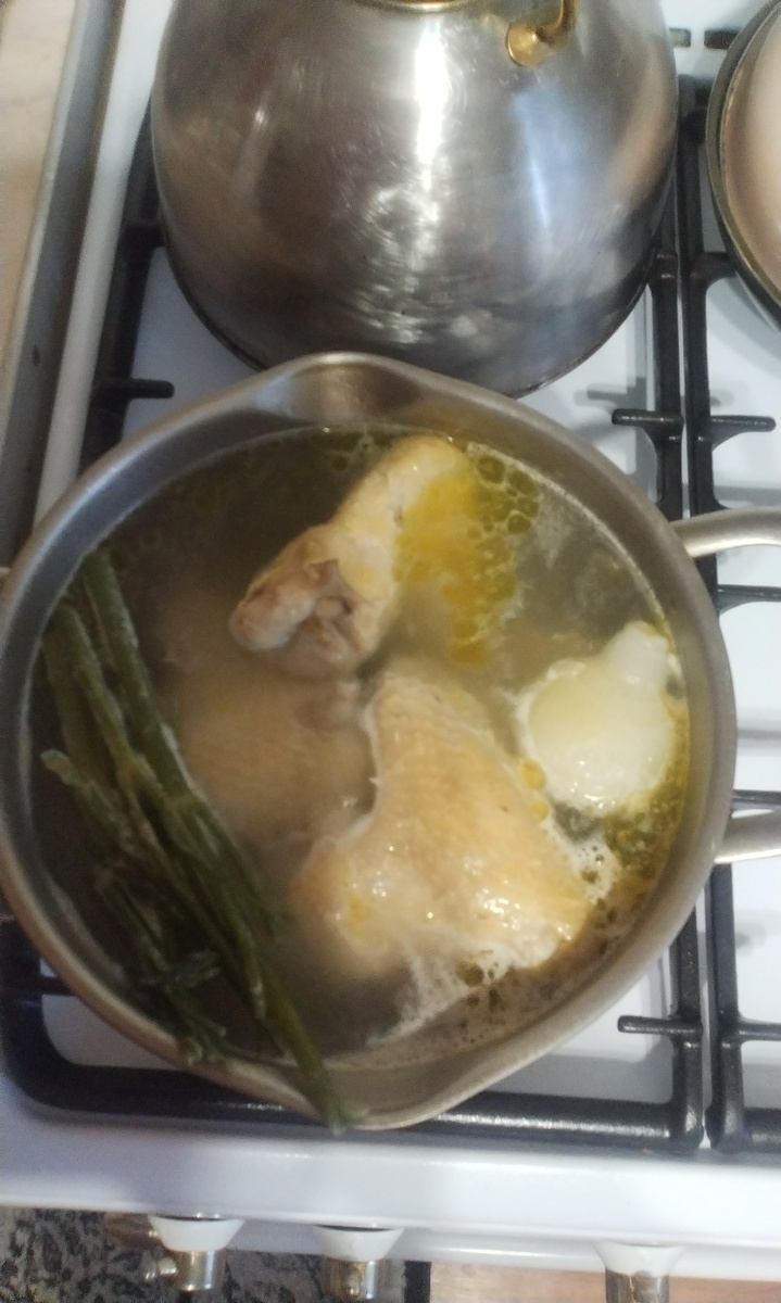 Готовил рассольник. Я его очень люблю. У меня было три куриных крылышка. Поставил варить бульон. Бросил туда луковицу и стебли зеленушки. Получился приличный бульон. Добавил две картошки, предварительно вытащив из бульон крылья, лук, стебли зеленушки.