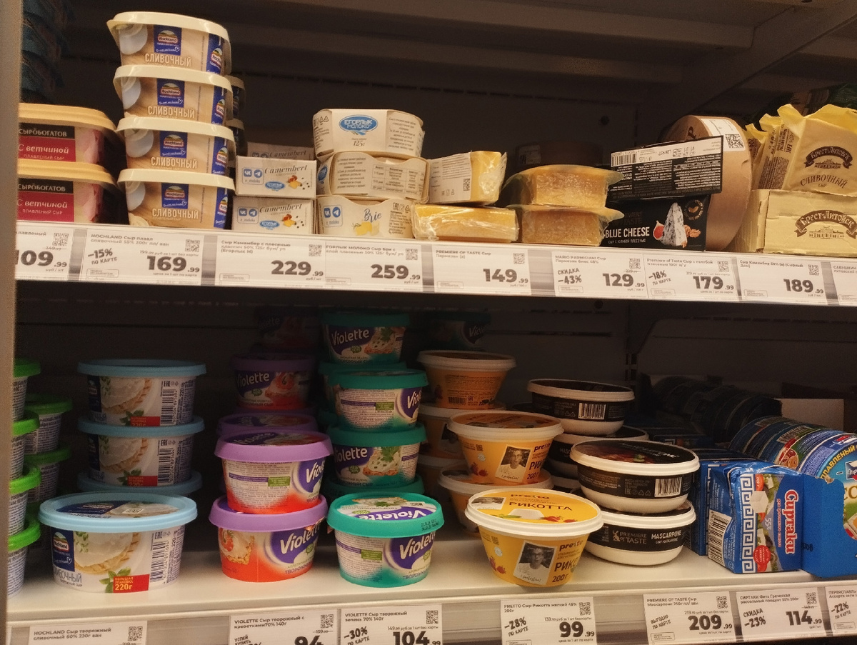 И откроют наш сегодняшний обзор сыры, поскольку именно с них и началось мое посещение магазина. Кстати, интереса ради, а что нынче с плавленым сыром в ломтиках? Ни в одном супермаркете не было выбора, один сырный продукт с заменителем и один сыр, все. Из акций же определенно хочу отметить творожный сыр "Violette" с ценой в 94-104 рубля, рикотту за 99 рублей, "сиртаки" за 114 (тоже не в восторге от состава, но тут каждому свое) и плавленый сыр в лотке от "Hochland" за 169 рублей.