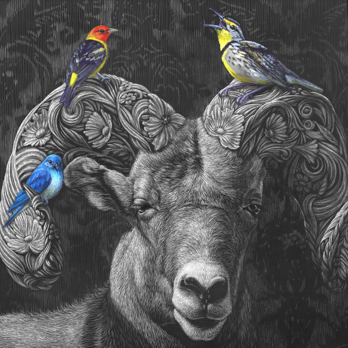 Художница создает черно-белые портретные рисунки животных, переплетающиеся с яркими цветами, птицами и насекомыми. Черные и белые участки нарисованы иглами для татуировок на панелях для скретчборда. Цветные элементы окрашены акриловыми красками.