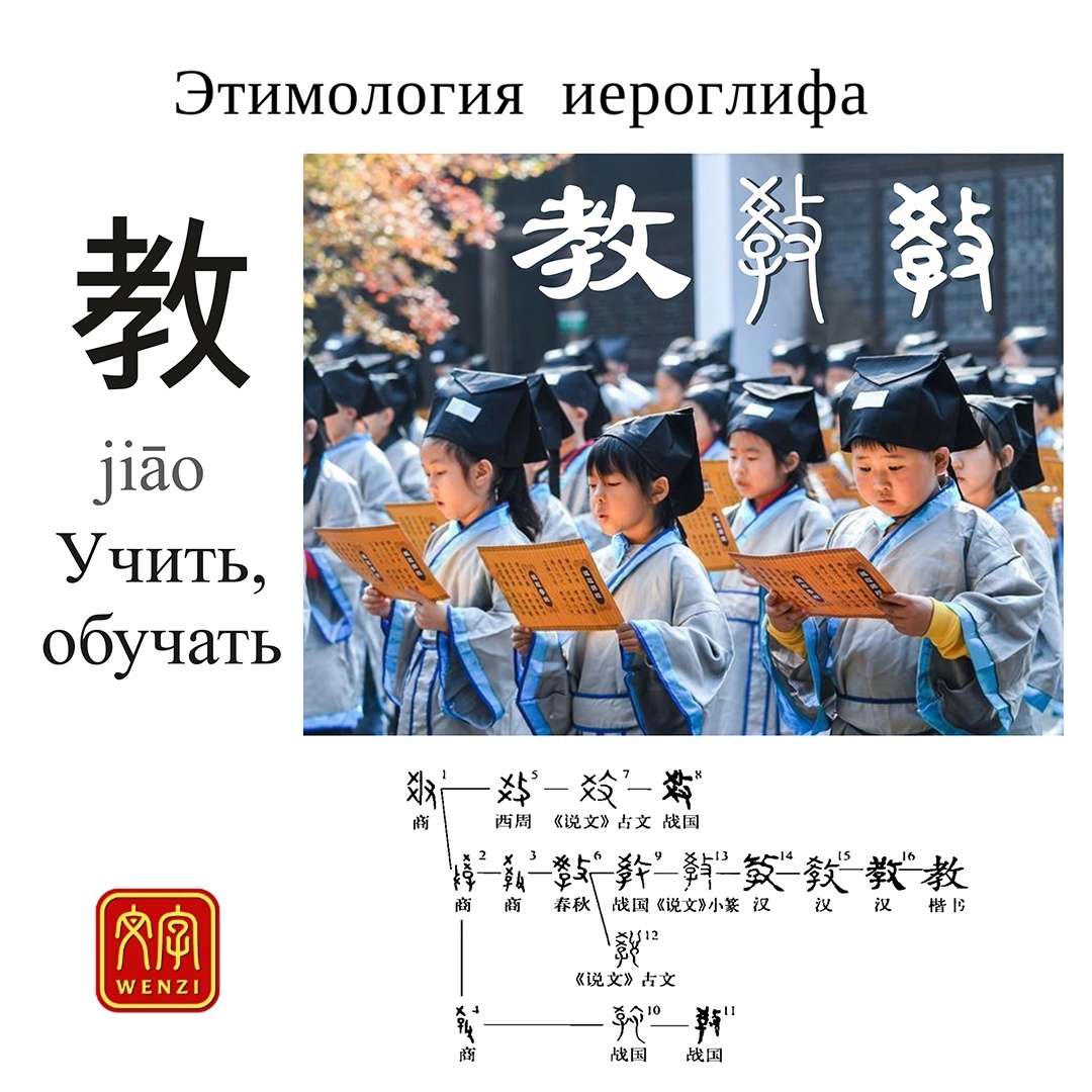 Иероглиф 教 jiào (учить, обучать, наставлять) претерпел мало изменений с древнейших времен до наших дней. Его левая сторона перв