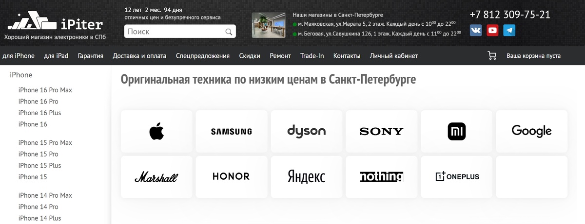 iPiter — это магазин электроники, специализирующийся на продаже оригинальной техники Apple по доступным ценам. Расположенный в центре Санкт-Петербурга, он предлагает широкий ассортимент продукции, включая новейшие модели iPhone, iPad и MacBook. Магазин привлекает покупателей не только выгодными ценами, но и высоким уровнем обслуживания.