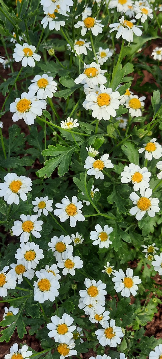 Прошлой осенью купила маленький кустик матрикарии и высадила его в цветник.Цвела матрикария с июня до октября и за одно лето нарастила большую куртинку.