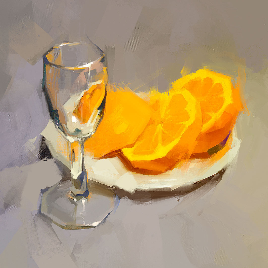 Самая выигрышная композиция — когда предметы смело перекрывают друг-друга. Особенно это уместно с прозрачными предметами. Идеально, когда один объект, как бы, переплетается с другим. В данном случае, апельсинка проникает в рюмку. А тарелочка заигрывает с ножкой рюмки. Когда речь идет о прозрачных или зеркальных поверхностях, самый лучший метод — поиграться с интересной композицией на натуре и затем старательно скопировать все отражения и переломления, ничего не выдумывая. Разумеется, можно обобщать подробности и опускать мелкие детали, чтобы избежать замусоренности композиции. Но из головы изобретать ничего не нужно. Однажды, одна комментаторша в Инстаграм написала, что, если бы была ее воля, она отодвинула бы рюмку от тарелки, чтобы та не закрывала апельсин. Так вот, замечательно, что не ее воля и она не может этого сделать. Чем скучнее композиция, тем меньше комментариев и ниже рейтинг. Нужна практика? Записывайтесь на ближайший мастер-класс прямо сейчас.