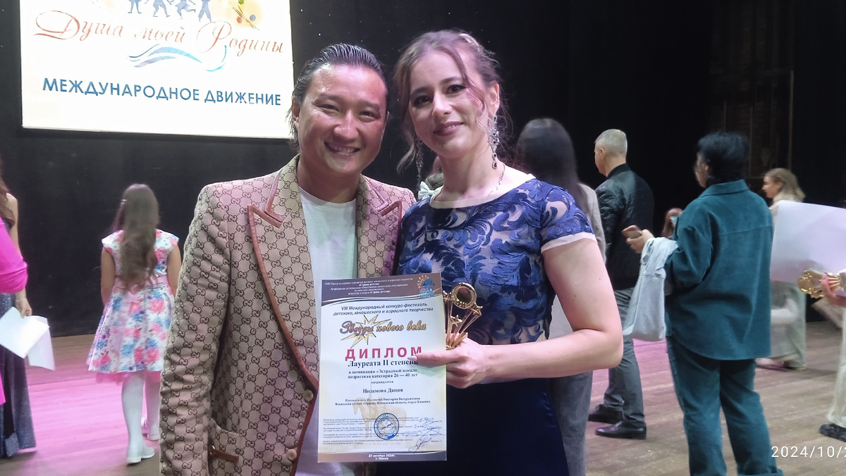 Совсем недавно мы приняли участие в Международном конкурсе "Звезды нового века". У моей взрослой ученицы Дании это был дебют. Все прошло великолепно, Дания стала лауреатом второй степени, и ей очень понравилось выступать. Надеюсь, в будущем нас ждут новые открытия. Этот конкурс стал не только важным этапом в её творческой жизни, но и открыл двери к новым возможностям. За кулисами мы встретили множество талантливых исполнителей, каждый со своей уникальной историей, стремлением и мастерством. Благодаря этому опыту Дания обогатила свой репертуар, черпая вдохновение из выступлений других участников. Она осознала, насколько важно общение и обмен опытом с единомышленниками. Это сблизило нас как команду, и теперь мы с нетерпением ждем новых вызовов. Конкурсы открывают горизонты, дарят уверенность в себе и помогают увидеть талант изнутри. Международный фестиваль «Звезды нового века» г. Пенза, 27 октября 2024 Я верю, что это только начало. Наша работа над техникой и выразительностью станет