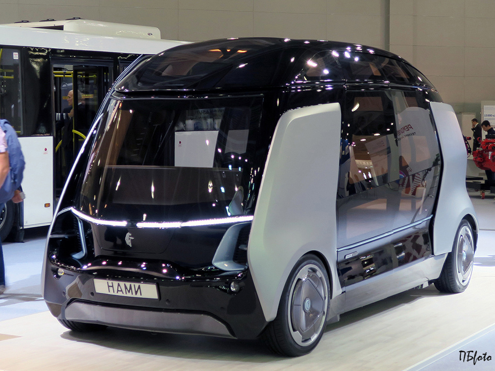 Беспилотник "Шатл". На Московском автосалоне в 2016 г впервые был показан проект беспилотного транспортного средства "ШАТЛ" (ШирокоАдаптивная Транспортная Логистика). Проект разрабатывался в НАМИ, техническим партнёром выступил КАМАЗ, а специалисты Яндекса отвечали за программное обеспечение. Представленные фотографии сделаны уже в следующем году на выставке "Комтранс-2017". Беспилотник рассчитан на перевозку 12 пассажиров из которых шестеро едут сидя на двух трёхместных сиденьях, установленных спереди и сзади салона, причём передние установлены против хода движения. Посадка и высадка пассажиров просходит через радвижные двери в середине кузова. Для информирования пассажиров в стойки кузова встроены жидкокристаллические мониторы, а взаимодействие пассажиров с электробусом происходит через приложение смартфона. Накопителями электроэнергии служат литий-ионные аккумуляторы расположенные под полом и сиденьями. По данным из рекламного проспекта следует, что номинальная мощность составляет 4