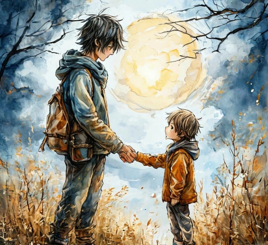 Сон накрыл юношу как тёплый плед, унося в мир воспоминаний. Он оказался в своём детстве, возле пруда, где отражались облака и светило солнце. Там, среди зелени, маленький он, с острыми чертами лица, одиноко сидел на краю.