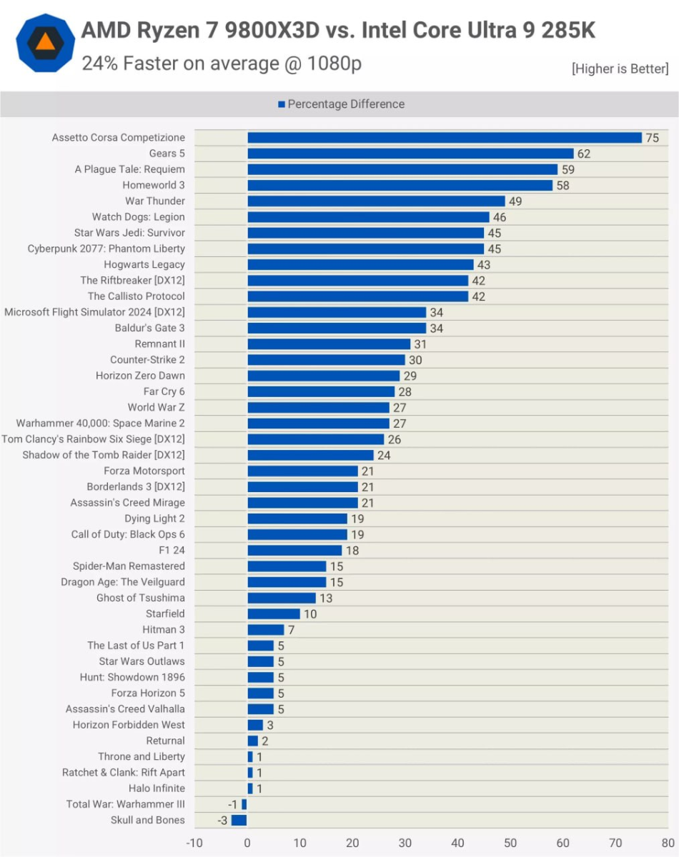 Ryzen 7 9800X3D опередил Intel Core Ultra 9 285K в тестах TechSpot