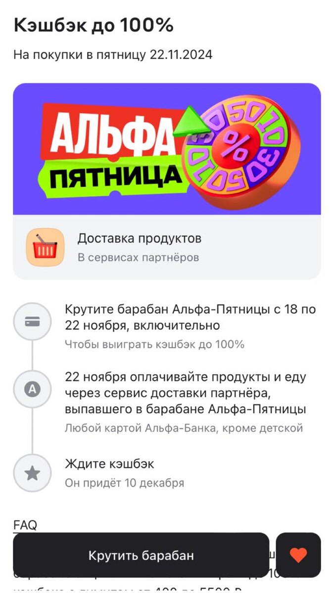 Вчера была пятница. Каждую пятницу в приложении можно покрутить барабан и выиграть один из вариантов кэшбэка. В прошлую пятницу розыгрыш был мне не особенно интересен (магазин косметики). А вот вчера то, что нужно — кэшбэк 15-100% на покупку в Доставке продуктов (Магнит, Пятерочка). Покрутила я барабан в приложении, и мне выпал 20% кэшбэк в Магнит доставке. По условиям акции кэшбэк не мог превышать 500 руб. Все равно приятно, тем более что продукты покупать нужно постоянно. В общем после оплаты покупок действительно кэшбэк был 20%. С этой картой реально получается неплохо экономить. Кэшбэк начисляется 10 числа каждого месяца. Так что свои 500 рублей (ну почти) жду 10 декабря обратно. Причем именно рублями, а не бонусами какими-нибудь. Кстати 500 руб за оформление карты я вывела сразу и уже потратила. Если хотите узнать подробнее о карте — пишите, расскажу и покажу😉 Друзья, у себя на канале я рассказываю, как зарабатываю на разных проектах и экономлю свой бюджет. Подписывайтесь, если и