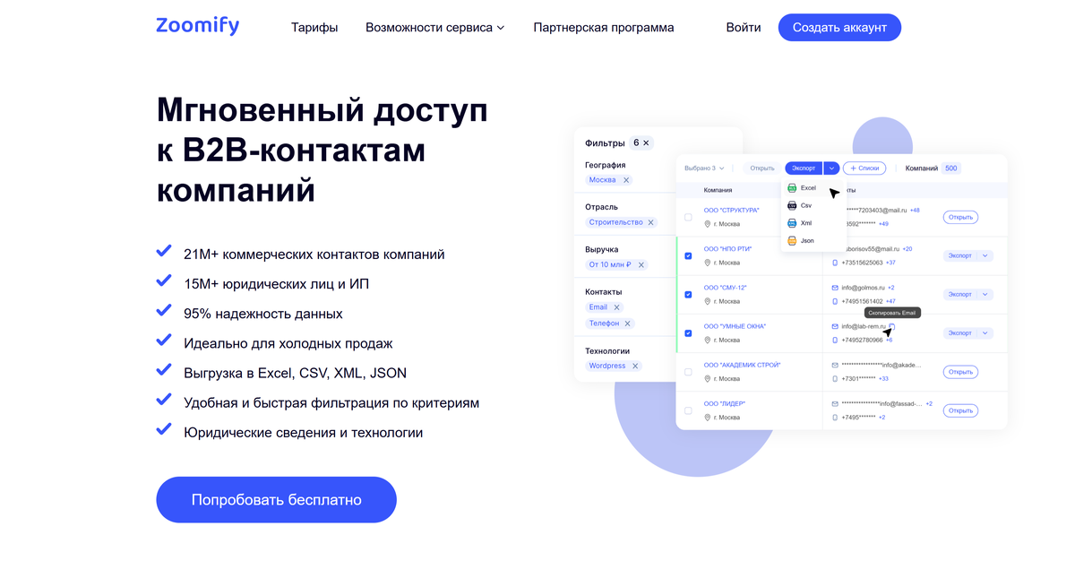 Платформа Zoomify предоставляет доступ к подробным данным о компаниях в сфере B2B: контактные данные, юридическая информация, технологии компаний и многое другое. Zoomify позволяет находить контактную информацию организаций, включая email, телефонные номера и социальные сети для быстрого начала общения с потенциальными партнерами или клиентами.
