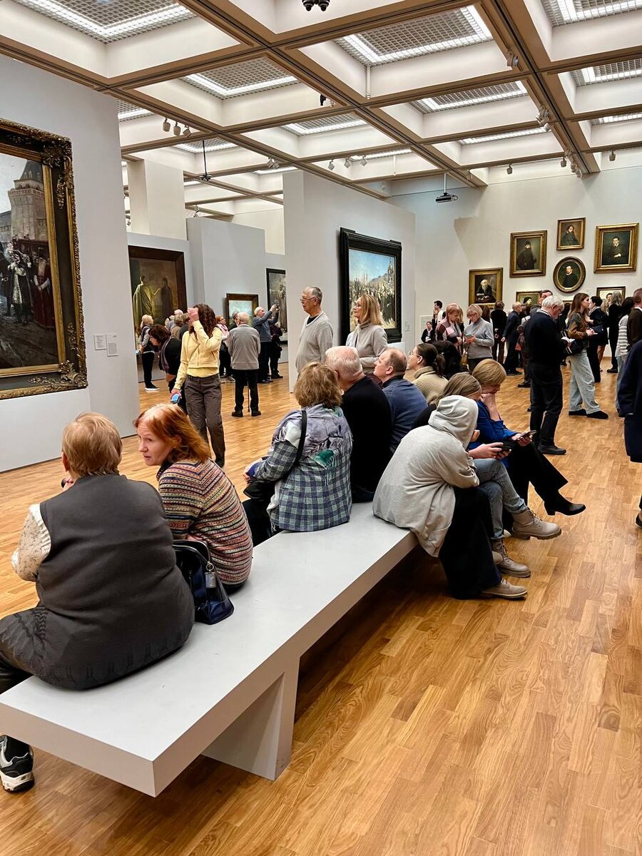 Вы увидите картины Перова, Крамского, Репина, Куинджи, Саврасова, Шишкина, Поленова, Левитана, Васнецова, Прянишникова, Ярошенко и других художников.