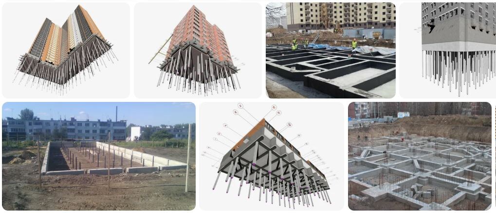 Подскажите, а какие типы фундамента используются для многоэтажных зданий? Я понимаю, что лучший вариант — это использование монолитного фундамента, но насколько это оправдано с технической точки зрения, поскольку такой фундамент обходится достаточно дорого и достаточно трудозатратен, не говоря уже о том, что приходится ждать застывания бетона не менее месяца, прежде чем появляется возможность продолжить строительство. Фундаменты многоэтажных зданий всегда выполняются в монолитном железобетоне, несмотря на то, из чего в дальнейшем планируется возводить стены этих зданий. Другие типы фундаментов, в частности ленточный монолитный применялись, но редко. Так что если вы действительно интересуетесь многоквартирным зданием, то следует внимательно изучить тех. документацию таких проектов.