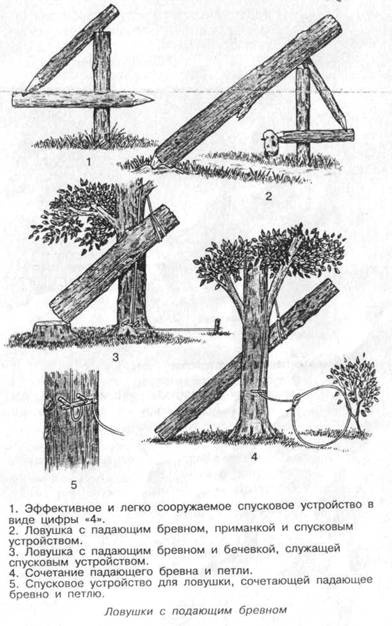 Для ловли дичи употребляются башмаки, вентеря, ворота, давушки, капканы, клади, клетушки, кляпцы, кобылки, ковши, колоды, колпаки, коши, крючки, кузова, кулемы, мыше- и крысоловки, обметы, падины, пасти, перевесы, песты, петли, плашки, поножи, пружки или подпружки, саки, самоловы, самострелы, сжимы, силки, слопцы, стульчики, ступы, тенета, тынки, черканы, шатры, ямы и др.