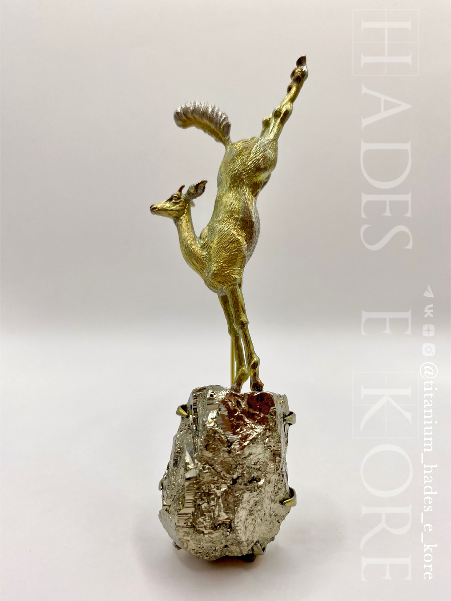 «Золотая антилопа» Брошь-кулон из титана и пирита с импалой на скале Анодирование, ручная резьба по титану Размер 98*34*25 мм Титан, стандарт ASTM F67 Пирит Вес 49 г Украшение в единственном экземпляре, точное повторение невозможно Символизирует один из смертных грехов - алчность и жажду наживы. Пирит, «золотая обманка», получил сие прозвище в период золотых лихорадок, когда его выдавали за самородное золото. Но на самом деле, будущая хозяйка броши не обязана пояснять всем невеждам, что самородок не настоящий :) Брошь из коллекции «Смертные грехи и добродетели». Всего в коллекции будет 7 украшений разного вида: броши, значки, кулоны, платок в пиджак. Фигурка вырезана в ручную из чистого титана. Титан не подвержен изменениям под воздействием окружающей среды, не почернеет, не позеленеет и не окрасит вашу одежду. Идеально совместим с кожей, не вызывает аллергии. Коллекцию можно будет приобрести в 2025 году в галере «Частная коллекция», г. Сочи. Доставка по России также будет возможна.