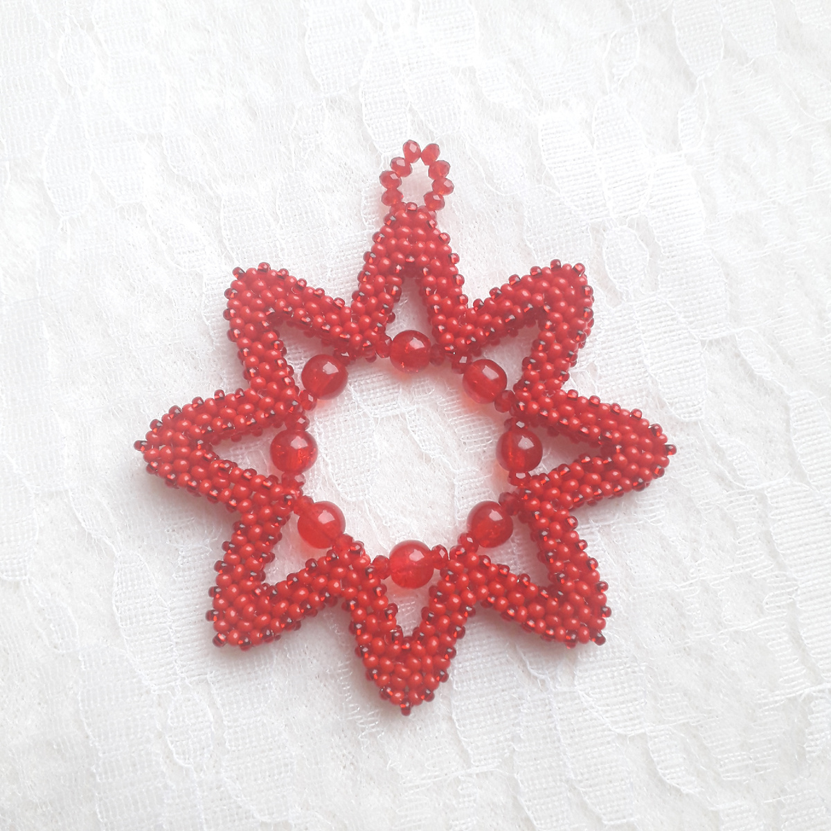 Добавить бусину 2 мм. - бусину 5 мм. - бусину 2 мм. между основаниями лучиков. Нить проводить между нижними бисеринами на основании лучиков с обеих сторон. Сначала круг по одной стороне, потом круг по другой стороне. Заправить нити в плетение.