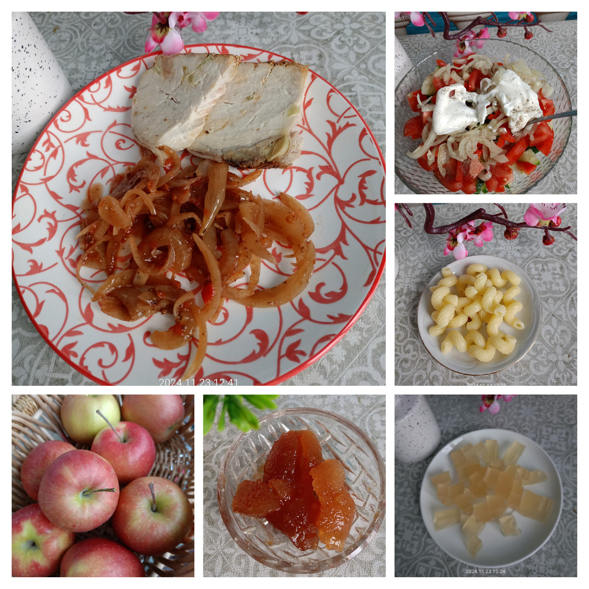 Завтрак - салат из помидора, огурца, красного перца, пекинской капусты и маринованного лука, заправка мацони. Корейка запеченная и лук тушёный, макароны вместо хлеба.