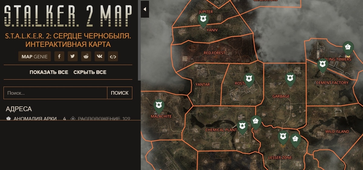 Полная подробная карта по игре Сталкер 2 - https://days-gone.ru/karta-stalker2/ На карте можно удобно выбирать метки .Например можно чтоб показывались только артифакты, или базы. Это очень удобная карта для игроков в сталкер2 . Рекомендую посмотреть. Она поможет вам быстрей найти нужные артефакты.