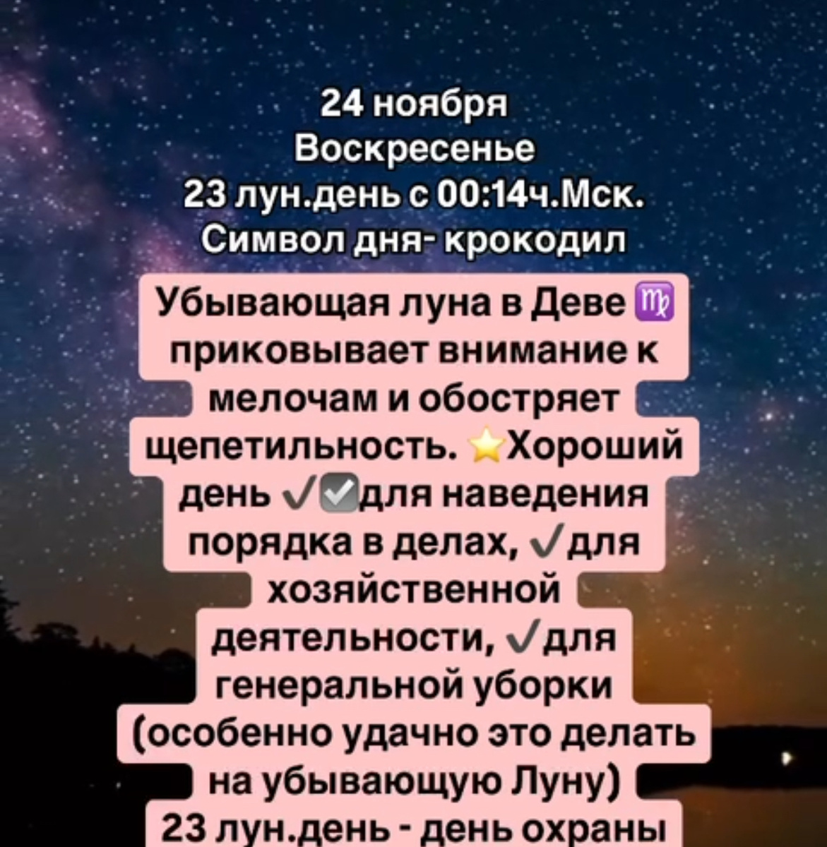 Убывающая луна в Деве ♍️ приковывает внимание к мелочам и обостряет щепетильность. ⭐️Хороший день ✔️☑️для наведения порядка в делах, ✔️для хозяйственной деятельности, ✔️для генеральной уборки (особенно удачно это делать на убывающую Луну) 23 лун.день - день охраны дома, проводят очищение огнем, окуривание травами. Также хорошо печь хлеб 🍞 ⛔️стрижка ⛔️покупки сны понимать с точностью наоборот #гороскоп #астрология #луна #астрологияонлайн #астропрогноз #овен #телец #близнецы #рак #лев #дева #весы #скорпион #стрелец #козерог #водолей #рыбы #затмениесолнца #солнечноезатмение #затмение #новолуниевблизнецах #загадываемжелания #загадайжелание #желание #Венера #мечтысбываются #полнолуние