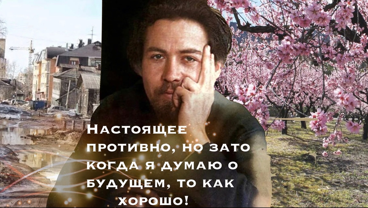Сегодня кругом царит вырождение — разруха, праздность, подлость, глупость. Это дикий пустырь, балка без единого деревца. На ней мы уже сегодня сажаем садик собственными руками, а разрастётся он уже после нашей смерти, — вот золотая мечта Чехова.