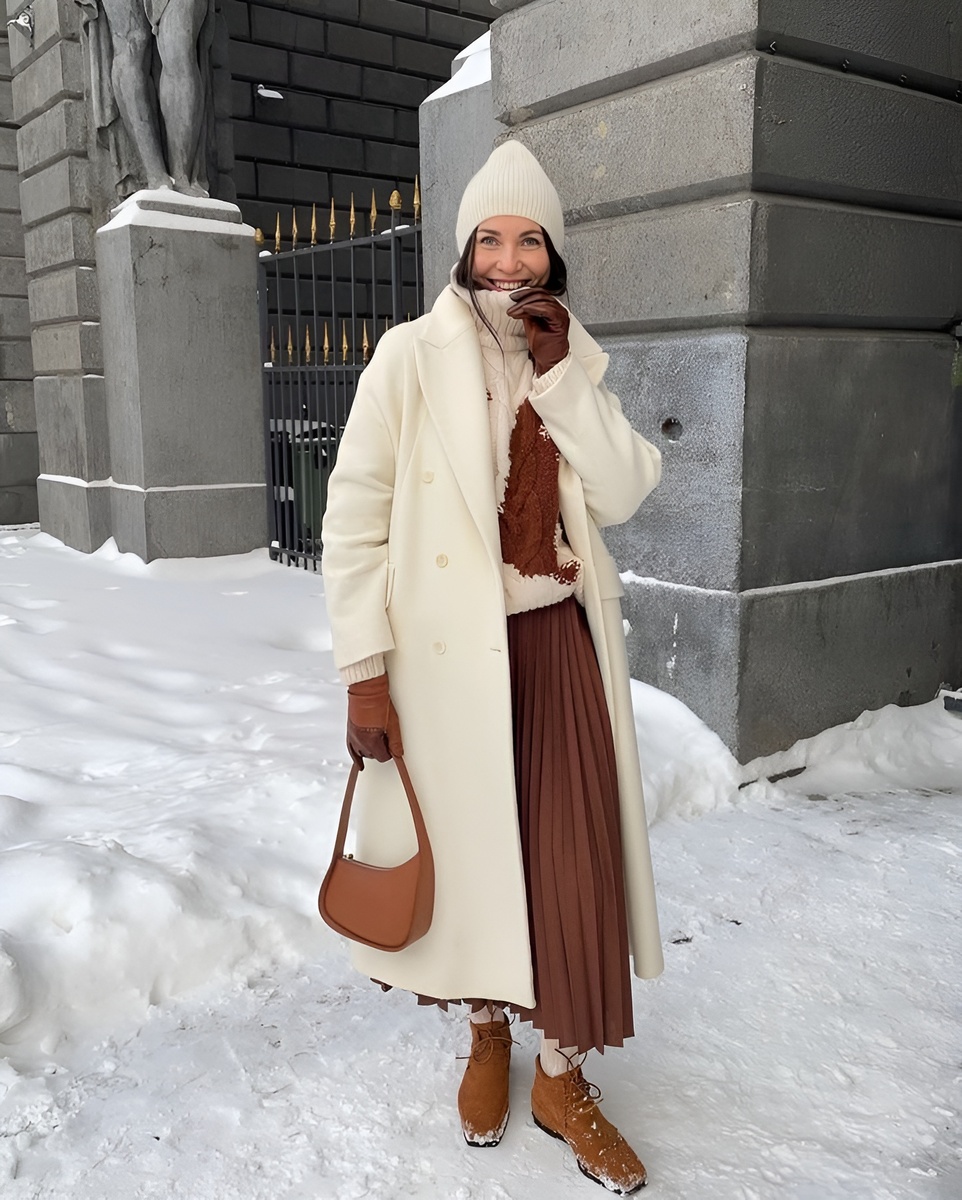 Современные леди даже в холода не забывают о женственности. Посмотрите, как уютно выглядит дуэт фактурного свитера и юбки-плиссе, молочное пальто добавляет наряду элегантности. Детали: замшевая обувь, сумка и теплые аксессуары.