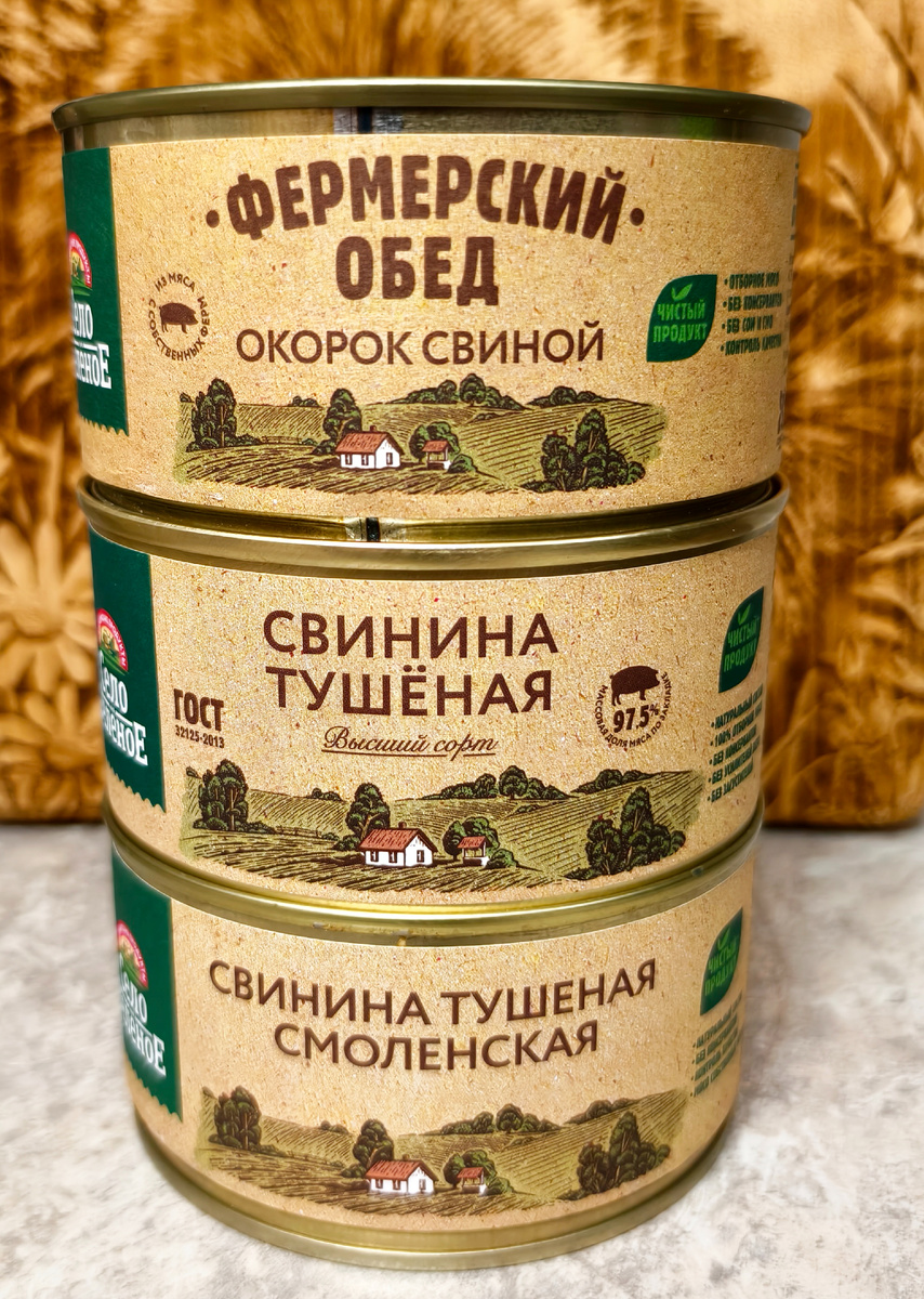 Всем привет! Сегодня на дегустации три вида консервов из свинины бренда "Село Зелёное". Это не реклама бренда, а так сказать, честный обзор. Купил в магазине Smart, больше нигде их не видел. До этого я встречался с этим брендом, когда покупал молоко. Прочитал в интернете, что они специализируются как раз на молочных продуктах. А тут свинина. Поэтому мне стало интересно, что они предлагают). Это примерно тоже самое, если бы вышел творог и йогурты от "Слова мясника". Изготовитель всего этого добра ООО "Сарапульский мясокомбинат" Удмуртская республика, г. Сарапул. Начну со свинины тушёной высшего качества. Масса 325 граммов. В составе свинина, лук репчатый свежий, соль, лавровый лист, перец черный. Массовая доля жира и мяса не менее 59%. А по закладке 97,5 % , уварилось немного. Срок годности в алюминиевой банке 4 года, жестяной 3 года. Как я понял моя банка жестяная. Срок годности в норме. Почти год банка меня ждала, пока не попала ко мне в руки. В банке достаточно аппетитное м