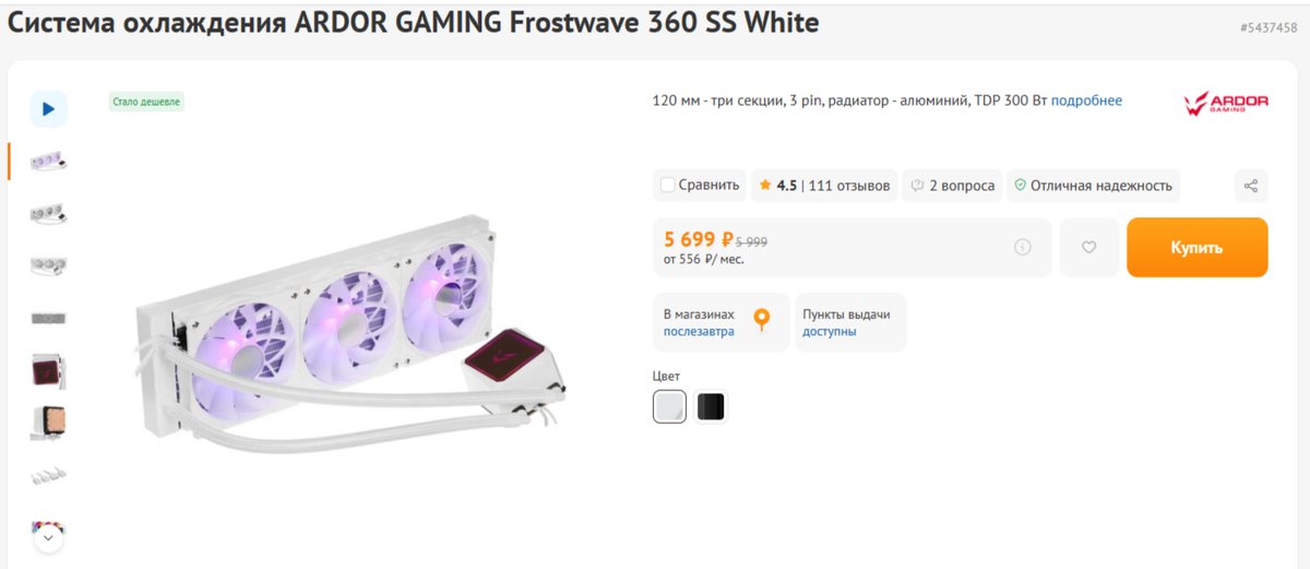 Ещё один неопровержимый плюс - это цена, водянка и вправду очень дешёвая. 4500 рублей - это цена хорошего кулера от Deepcool или BeQuite, который, скорее всего, будет хуже отводить тепло, чем СВО.