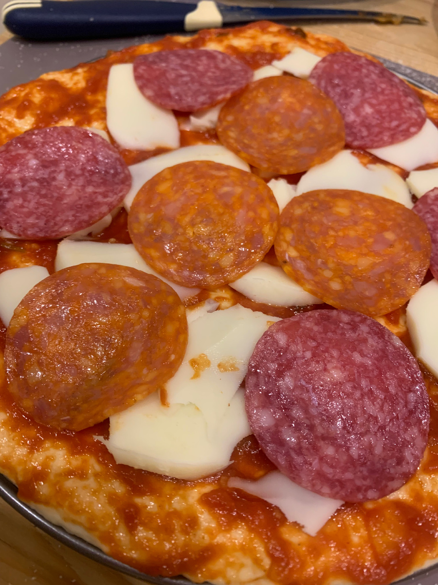 Ловите рецепт теста на пиццу, провереного мною много раз😉 ИНГРЕДИЕНТЫ( на две маленькие пиццы): ✅ Мука 350 гр ✅ Дрожжи 8 гр ✅ Соль 1 ч.л. ✅ Сахар 1 ст.л. ✅ Вода теплая 200 мл ✅ Масло растит. ≈ 40 мл. ✅Замешиваем и ставим в теплое место на 30 минут,после делим на 2 шарика и даем им постоять еще минут 15( так же в теплом месте). ✅ На дно противня посыпать манку! Раскатываем в круг руками, без скалки, не очень тонко и выкладываем начинку. ✅ Выпекаем в духовке 15-20 минут,до появления корочки на сыре. У меня начинка пепперони( томатный соус, колбаса пепперони и сыр моцарелла). Ну а вы можете выбрать на ваше усмотрение😊