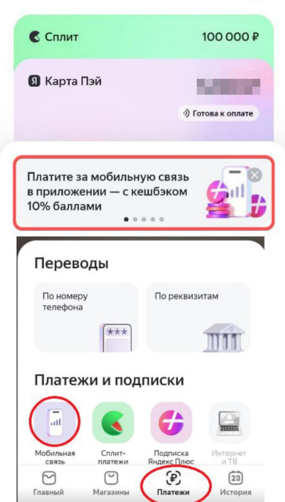 До конца ноября 2024 Яндекс Банк проводит акцию: за пополнение мобильной связи через приложение Яндекс Пэй вы получите 10% баллами Плюса от суммы платежа. Это отличный способ сэкономить и получить приятный бонус за регулярные расходы. 1. Обновите приложение. Убедитесь, что ваше приложение Яндекс Пэй обновлено до последней версии. Обновить можно в PlayMarket или RuStore. 2. Найдите баннер. На главной странице приложения под картой с балансом должен появиться баннер: «Платите за мобильную связь в приложении — с кэшбэком 10% баллами». Если баннер отсутствует, попробуйте обновить приложение или просто совершите оплату: у некоторых пользователей кэшбэк начисляется сразу после платежа, даже если баннер не отображается. ❗❗ Но хочу сказать, что по отзывам людей, если баннера нет, все равно кэшбэк начисляется. Попробуйте на небольшую сумму оплатить и увидите начисление кэшбэка. Нюанс: даже после обновления у небольшого количества пользователей так и недоступна оплата мобильной связи из приложе