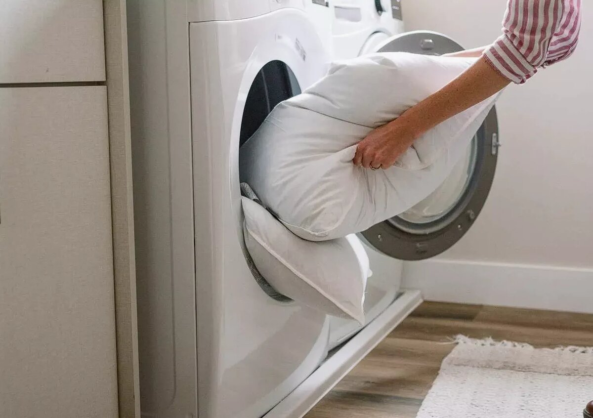 Перед стиркой нужно проверить, нет ли повреждений на чехле подушки. Постельную принадлежность необходимо сложить пополам и поместить в стиральный барабан. Если у подушки нет неприятного запаха, то можно ог