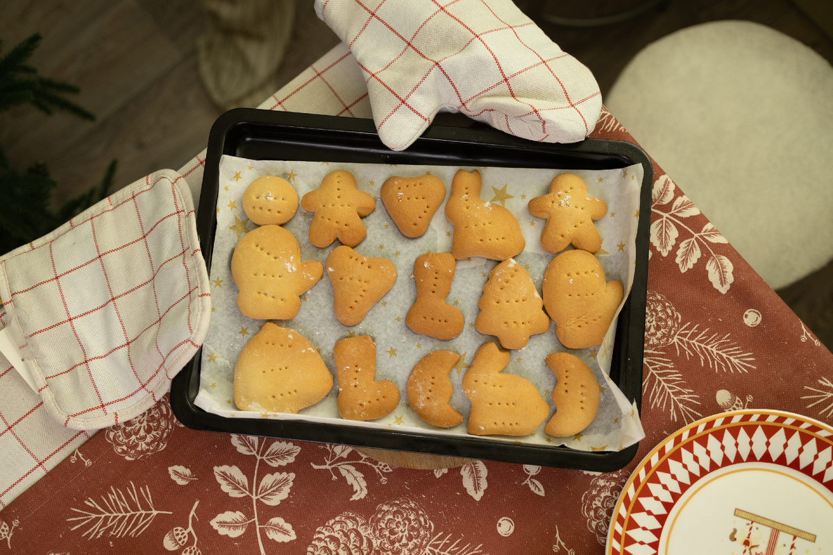 Присыпьте кулинарный коврик мукой, раскатайте тесто и вырежьте печенье с помощью формочек. На каждой получившейся заготовке сделайте несколько проколов вилкой.