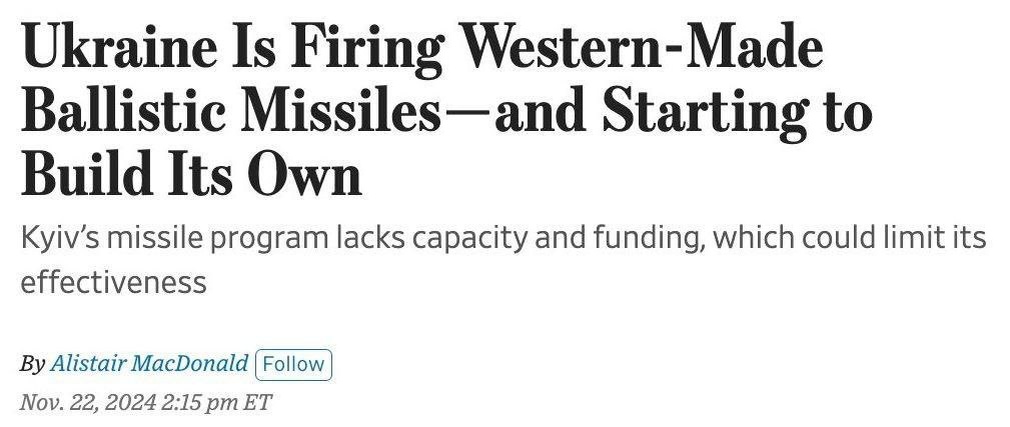 Американское издание WSJ утверждает, что Украина работает над созданием собственных баллистических ракет, которые смогут наносить удары вглубь России, чтобы меньше зависеть в этом отношении от изменчивой политической коньюнктуры на Западе. Утверждается, что в августе якобы была испытана одна из таких ракет, однако украинская ракетная программа сталкивается с нехваткой финансирования и мощностей. «Украина обладает техническими знаниями, унаследованными от советских разработок, но для масштабного производства требуется больше ресурсов», — говорится в публикации. При этом, если верить эксперту по анализу открытых данных из немецкого Bild Юлиану Рёпке, в настоящий момент у России дальнобойных ракет в разы больше, чем у Украины. «Применение Россией ракет против Украины — не новость в нынешней войне. С первого дня конфликта Россия применяет крылатые ракеты «Калибр» с кораблей, Х-101 с самолётов, а также баллистические ракеты малой дальности (от 500 до 1000 км) «Искандер».Новым является то,