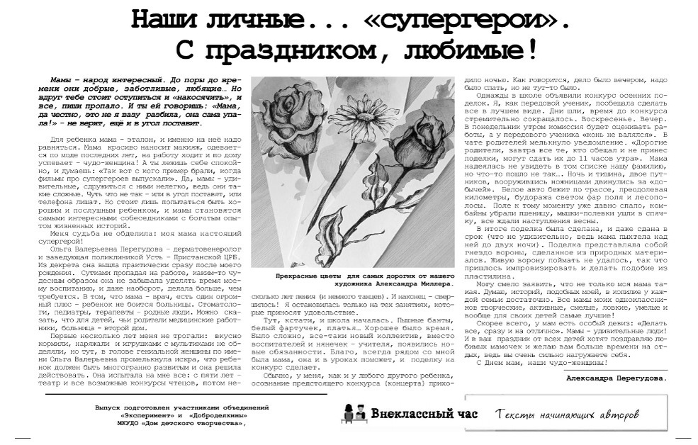 "Внеклассный час" с текстами начинающих авторов вышел в минувшую пятницу в районной газете. Конечно же, мы не могли не поздравить в выпуске всех замечательных мам Усть-Чарышской Пристани! Миссию поручили Александре Перегудовой)))) Наши личные... «супер герои». С праздником, любимые! Мамы – народ интересный. До поры до времени они добрые, заботливые, любящие… Но вдруг тебе стоит оступиться и «накосячить», и все, пиши пропало. И ты ей говоришь: «Мама, да честно, это не я вазу разбила, она сама упала!» - не верит, ещё и в угол поставит.