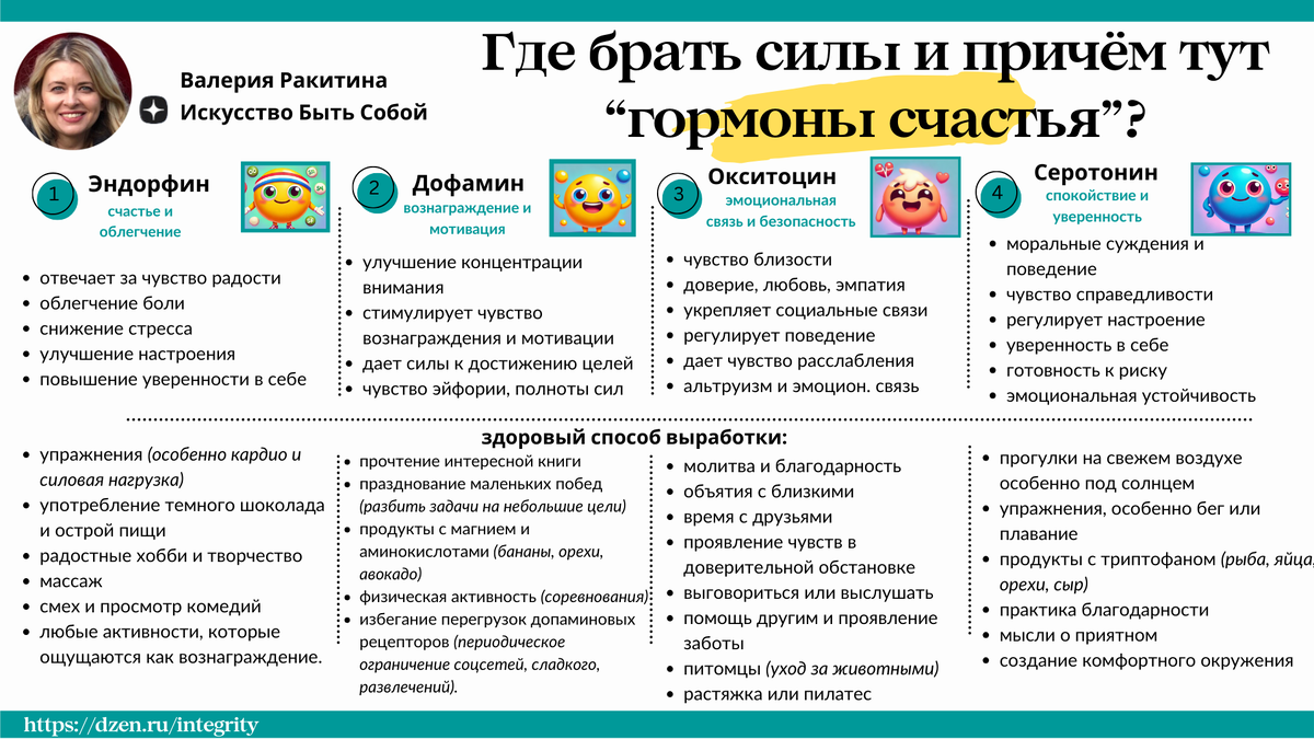 в любой сложной ситуации можно помочь себе выйти из грусти, раздражения, плохого самочувствия, зная, как работают эти нейромедиаторы и как можно здоровым образом повысить их выработку в организме в нужный момент.