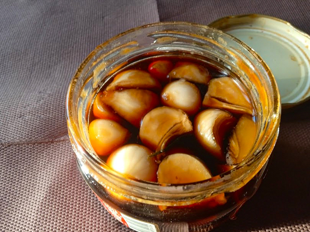 Приготовила на пробу ферментированный в меде чеснок. Уже писала, что попался на глаза интересный рецепт ферментированного чеснока. Очищенные зубчики чеснока нужно неплотно уложить в банку, залить мёдом, зарыть крышкой и поставить в тёмное место недели на две. Время от времени банку нужно встряхивать. Ну как пройти мимо такого интересного рецепта. Тем более, чеснок люблю, кладу его в горячее, в салаты, могу в прикуску с хлебушком поесть и запить молоком. Конечно же, сделала. Уложила чеснок в банку, залила жидким медом. Через две недели попробовала, еще совсем свежий был. Видимо потому, что взяла крупные однозубки. Разрезала их, и еще на неделю оставила в меде. Сегодня вспомнила про ферментированный чеснок. На обед, с пельмешками, и попробовала –порезала зубок меленько и посыпала пельмени. Лучше бы я этого не делала((( Пролежав три недели в меде, чеснок стал невероятно ядреным. И съела-то небольшой зубок, но так сдавило желудок, и весь оставшийся день в горле стоит неприятное послев