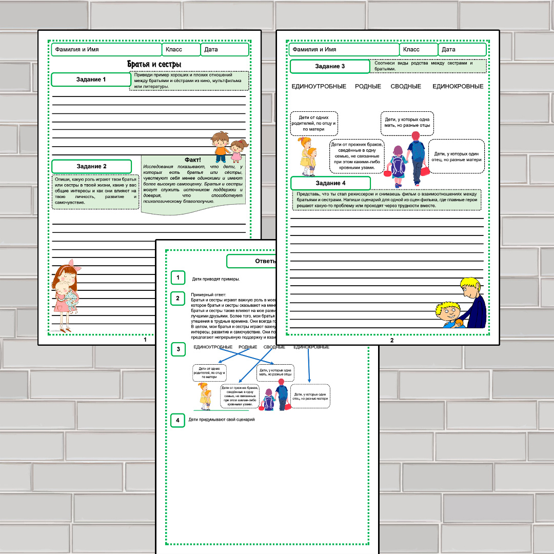 Задания: 1.Приведи пример хороших и плохих отношений между братьями и сёстрами из кино, мультфильма или литературы. 2.Опиши, какую роль играют твои братья или сестры в твоей жизни, какие у вас общие интересы и как они влияют на твою личность, развитие и самочувствие. 3. Соотнеси виды родства между сестрами и братьями. 4. Представь, что ты стал режиссером и снимаешь фильм о взаимоотношениях между братьями и сестрами. Напиши сценарий для одной из сцен фильма, где главные герои решают какую-то проблему или проходят через трудности вместе. Хотите разнообразить свои уроки или праздничные мероприятия? Присоединяйтесь к сообществу VK - Уроки Легко | Рабочие листы и шаблоны для печати - и не упустите возможность обновить свой арсенал шаблонов!
