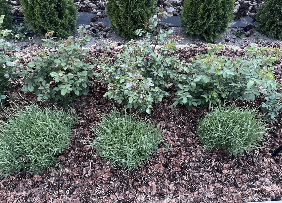 Вот мой розарий на входе во двор. Шишки смотрятся более декоративно. Поэтому нижним слоем опилки, шишки сверху.