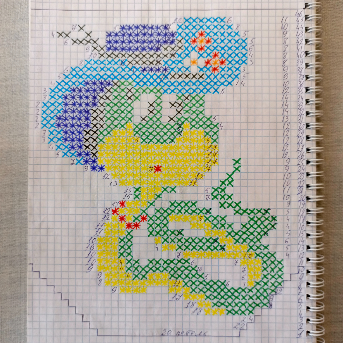 1ряд-вяжем косичку из 20 петель. 2,3 ряды вяжем основной нитью с прибавками до 24 петель. 4 ряд-1 осн.4 зел.3 жёлт.18 осн. с приб. 5ряд-8 зел.2 жёлт.18 осн. с приб. 6ряд-9 зел. без приб.3 жёлт.17 осн. с приб. 7ряд-12 зел.3 жёлт.3 осн.4 жёлт.9 осн. с приб. 8ряд-4 зел.1 жёлт.3 осн.6 зел.11 жёлт.8 осн. с приб. 9ряд-1 осн.2 зел.2 жёлт.6 осн.5 зел.3 жёлт.2 зел.4 жёлт.9 осн. с приб. 10ряд-2 осн.3 зел.2 жёлт.7 осн.10 зел.4 жёлт.9 осн. с приб. 11ряд-3 осн.3 зел.3 жёлт.7 осн.6 зел1 осн.2 зел.4 жёлт.10 осн. с приб. 12ряд-4 осн.3 зел.10жёлт.7 осн.2 зел.3 жёлт.10 осн. без прибавок. 13ряд-5 осн.3 зел.3 жёлт.7 зел.2 жёлт.4 осн.2 зел.3 жёлт.10осн. 14ряд-6 осн.4 зел.2 жёлт.8 зел.1 жёлт.3 осн.2 зел.3 жёлт.10осн. 15ряд-5 осн.6 зел.3 жёлт.3 осн.5 зел.2 осн.1 зел.3 жёлт.11 осн. 16ряд-4 осн.5 зел.1 осн.3 зел.3 жёлт.3 осн.3 зел.1 осн.2 красн. 3 жёлт.11 осн. 17ряд-4 осн.4 зел.3 осн.3 зел.5 жёлт.3 зел.1 красн.1 зел.1 жёлт. 1 красн.1 жёлт.12 осн. 18ряд-5 осн.5 зел.3 осн.8 зел.1 осн.1 зел.3 жёлт.1 красн.12 о