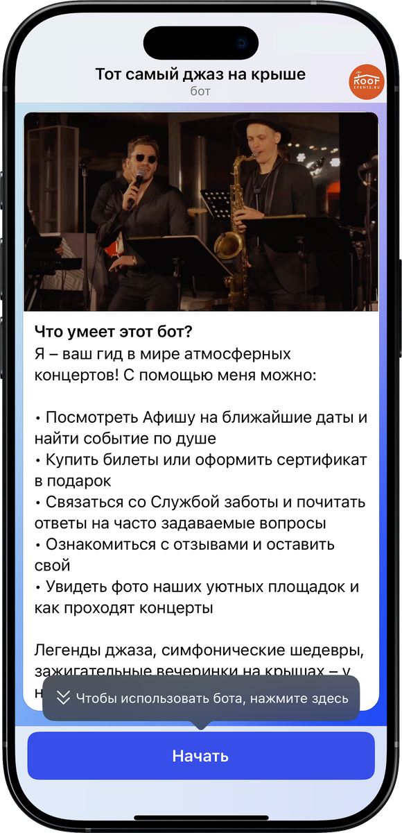 Чат-бот Roofevents. Самые атмосферные джазовые и симфо-концерты на теплых крышах и не только.