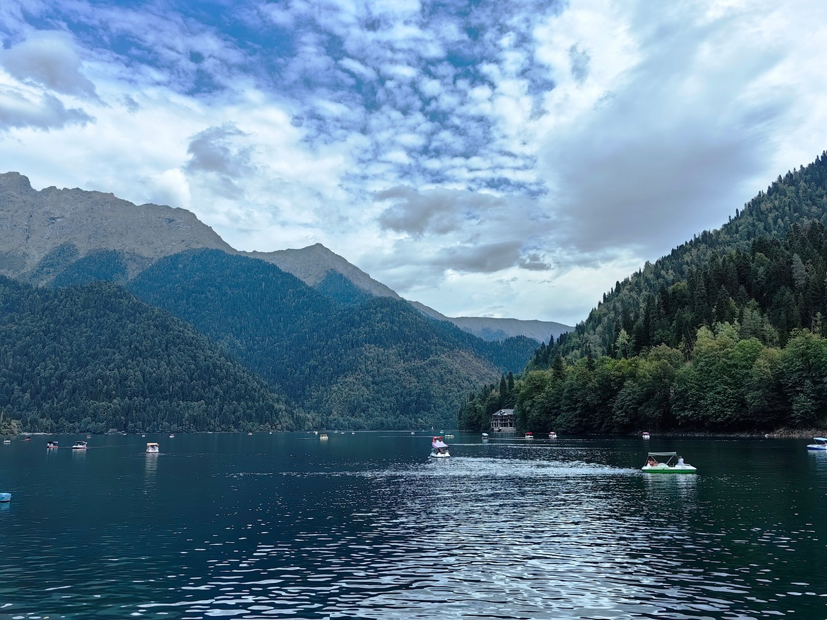Путь к перевалу Пыв лежал через Голубое озеро и жемчужину Абхазии — озеро Рица. Там у нас был обед в местном кафе и прогулка. Рица — настоящее место силы! Озеро, окружённое горами, покрытыми хвойным лесом. Бывали мы здесь и в мае и наблюдали заснеженные вершины — такой контраст лазурной водной глади, насыщенного хвойного массива и снежных шапок завораживает по-особенному!