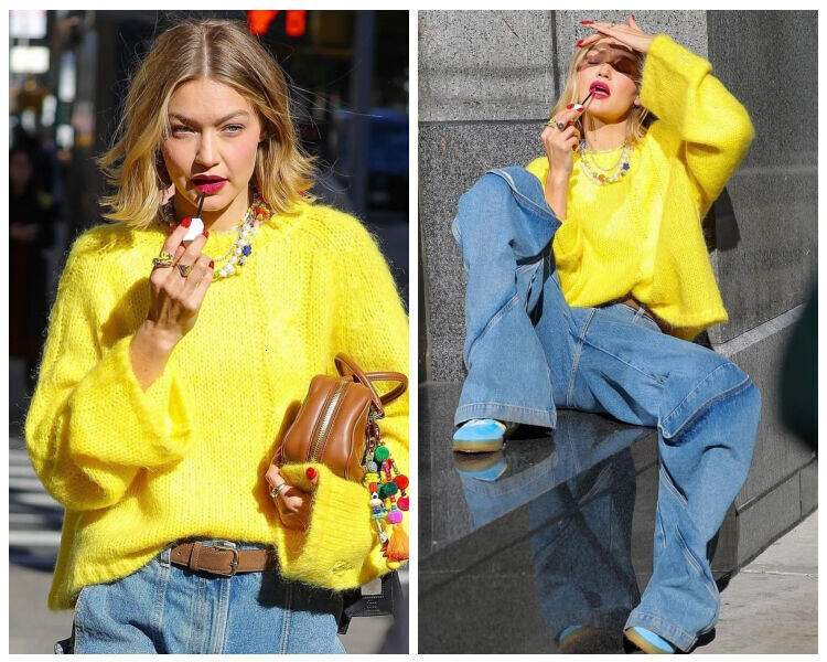 Джиджи Хадид — настоящая королева стритстайла. Девушка умеет подбирать образы так, чтобы они смотрелись просто и стильно, поэтому любой ее выход так бурно обсуждается поклонниками. Недавно бренд Maybelline провел съемку на улицах Нью-Йорка, лицом которой стала Джиджи. Я не смогла пройти мимо ее джинсов, поэтому предлагаю поближе рассмотреть эту вещь. На Джиджи — ярко-желтый объемный свитер и широкие джинсы свободного кроя. Образ дополнили кожаная коричневая сумка и ремень в том же оттенке. Красный маникюр и яркая помада отлично контрастируют с желтым верхом. Несмотря на насыщенную цветовую палитру образа, в глаза сразу бросаются необычные джинсы. Ультраширокие брючины с декоративными элементами в виде дополнительных швов и накладных карманов смотрятся необычно и точно выделят любой образ, даже если он составлен из базовых вещей. Эти джинсы идеально вписываются в современные тренды на объемные и свободные силуэты. Такой фасон подходит практически всем, поскольку визуально удлиняет ноги