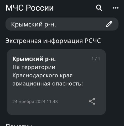 На территории Крымского района Краснодарского края объявлена авиационная опасность. Соответствующее предупреждение в 11:48 опубликовано в официальном приложении МЧС в воскресенье, 24 ноября. Прошлый раз такой сигнал об опасности поступал 20 ноября. Он распространялся сразу на несколько районов Краснодарского края, в том числе и на Крымский муниципальный район. Там он в тот раз действовал на протяжении 10 минут. Напомним, как ранее писал «Югополис», 21 ноября над Россией было сбито более 60 беспилотников. А также две ракеты Storm Shadow, как сообщили в российском Минобороны. Однако тогда не было дано никаких подробностей о том, над какой именно территорией сбили ракеты. Широкий резонанс ранее вызвало разрешение со стороны США Украине использовать дальнобойные ракеты для поражения целей в глубине РФ.