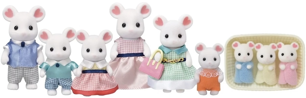 Зефирные мышки - семья противоречивая. Кому-то они очень нравятся, а кто-то считает, что из-за сердечек в ушах вид у мышек совсем уж мультяшный и в Сильванию они не вписываются. Действительно, с мимимишностью мышек несколько переборщили и контраст со старыми сильванскими семьями слишком велик. Для российского рынка фамилию семьи решили перевести и превратить в эпитет. Мне такой подход кажется разумным. Звучит куда лучше, чем семья Зефир или семья Маршмеллоу. Семья мышек вышла в 2018 году сразу во всех странах. Японское издание: Европейское издание: Calico critters: Как видно, во всех странах выпустили одинаковые наборы. В Японии мышки также выходили в индивидуальных коробочках: Для семьи выпустили малыша. В первом выпуске малыш был с традиционной кроваткой и бутылочкой: Чуть позже наборы со стоящими малышами изменили. Мышонка тоже выпустили в обновленной версии: Также для семьи выпустили микро-малышей: Близнецов почему-то выпускать не стали. Calico Critters традиционно не стали