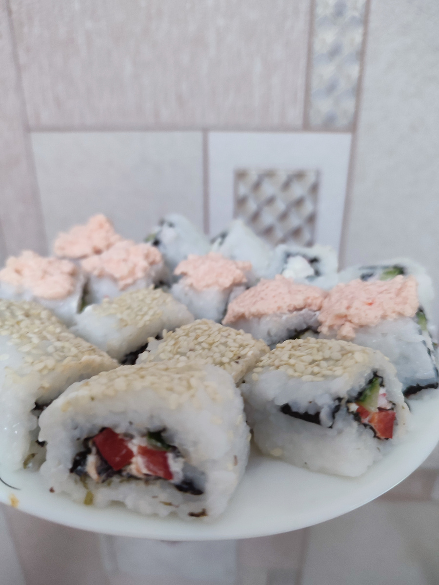 В этом году решила по примеру своих знакомых начать крутить роллы, но как я уже говорила ранее, красивая кулинария это не мой конек)) Это был первый и вполне удачный опыт. Не планировала выкладывать на обозрение, просто фоткала на память. В следующий раз я наварила слишком много риса и устала крутить, вспомнила про онигири, посмотрела, как их делать. Оказалось, что так гораздо быстрее. В трерий раз я уже купила формочки для онигири и дело пошло еще быстрее. Наша любимая и достаточно доступная начинка: Треть зимнего огурца, пара-тройка крабовых палочек и несколько ложек творожного сыра. Этого хватает на стакан риса. Мелко порубить огурец Добавить меленько порезаные крабочки, я люблю имитаю под снежного краба. Несколько ложечек творожного сыра по вкусу. Рис нужно варить по инструкции на пачке, я пробовала двух фирм и обе варятся разное время. Рисовый уксус тоже по инструкции добавляю. Вот так выглядят форочки. Есть разных размеров. В одну часть добавляется рис с начинкой, второ