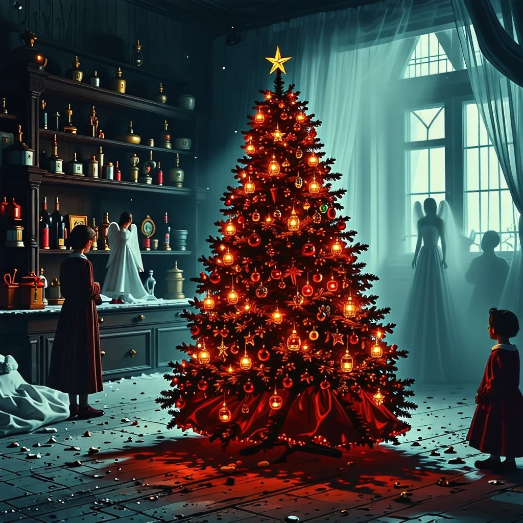 Призрак начал растворяться в воздухе. В этот момент все игрушки на ёлке едва заметно качнулись, а стеклянный ангел... подмигнул Анне чёрным провалом глаза.