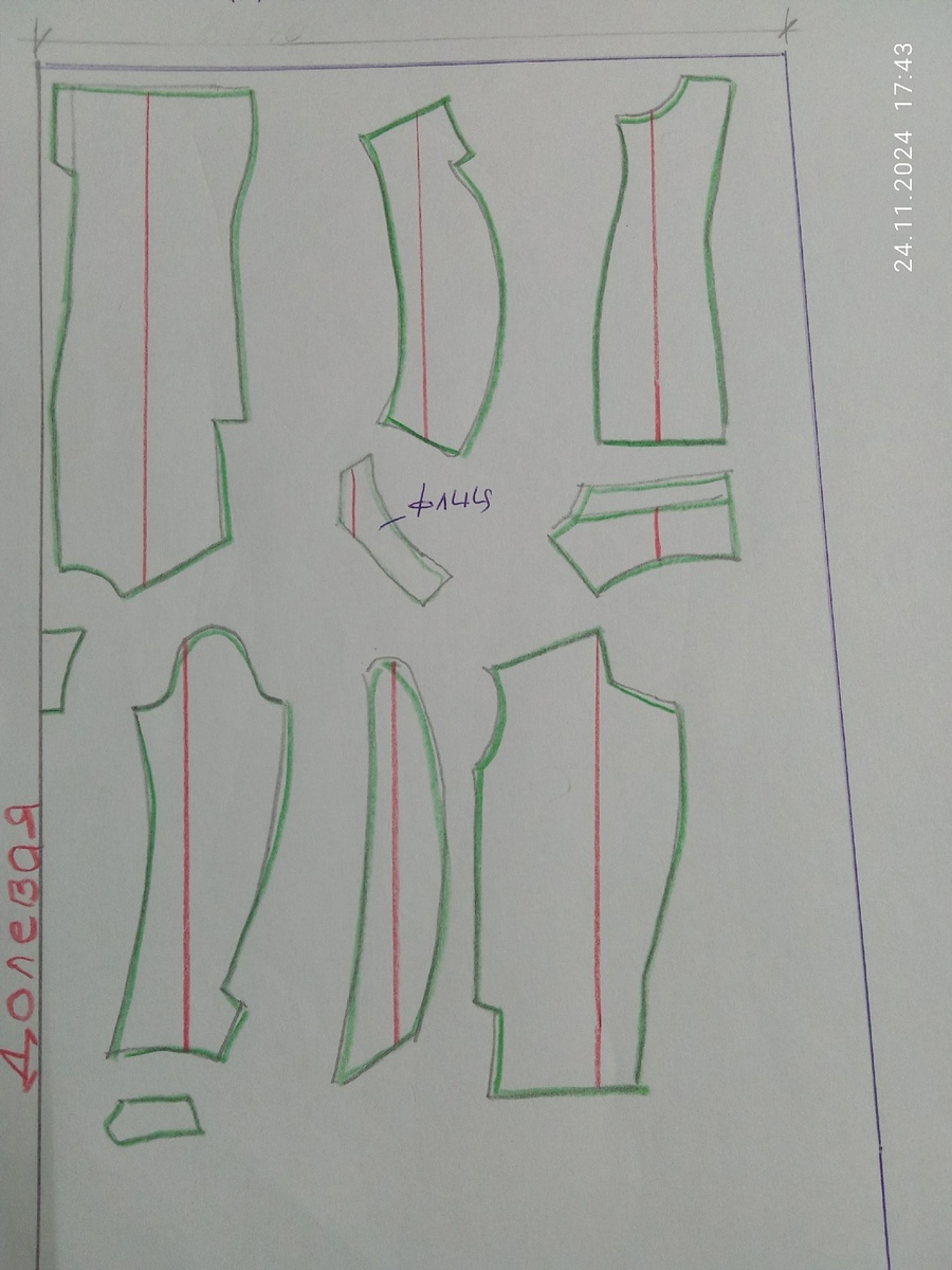 На листе бумаги нарисованы схемы основных деталей мужского пиджака. КРАСНОЙ ЛИНИЕЙ обозначено долевое направление нити ткани. Флиц в центре рисунка - это схема нижнего воротника он выкраивается не из основной ткани. Флиц материал для нижнего воротника. Так легче запомнить. Перечислю нарисованные детали .Спинка. Нижняя часть рукава. Бочок. Нижний воротник из флица. Верхний воротник. Верхняя часть рукава. Подборт. Передняя полочка. Небольшие детали в следующих рисунках с подробным описанием.