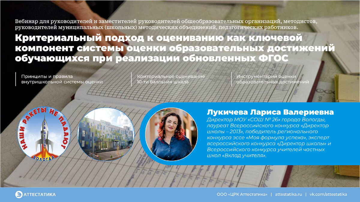 Вебинар «Критериальный подход к оцениванию как ключевой компонент системы оценки образовательных достижений обучающихся при реализации обновленных ФГОС» будет интересен педагогам, директорам и завучам образовательных организаций. На вебинаре опытом реализации критериального подхода к оцениванию поделилась Лариса Валериевна Лукичева – директор МОУ «СОШ № 26» города Вологды, лауреат Всероссийского конкурса «Директор школы – 2013», победитель регионального конкурса эссе «Моя формула успеха», эксперт Всероссийского конкурса «Директор школы» и конкурсной комиссии Первого всероссийского конкурса учителей частных школ «Вклад учителя». Программа вебинара: 1. Реализация проекта «Внутришкольная система оценки на основе 10-балльной шкалы» в МОУ «СОШ № 26» г. Вологды» 2. Нормативно-правовые аспекты реализации внутришкольной системы оценки достижений образовательных результатов обучающихся 3. Инструментарий оценки образовательных достижений обучающихся с использованием КСО 4. Взаимодействие педагог